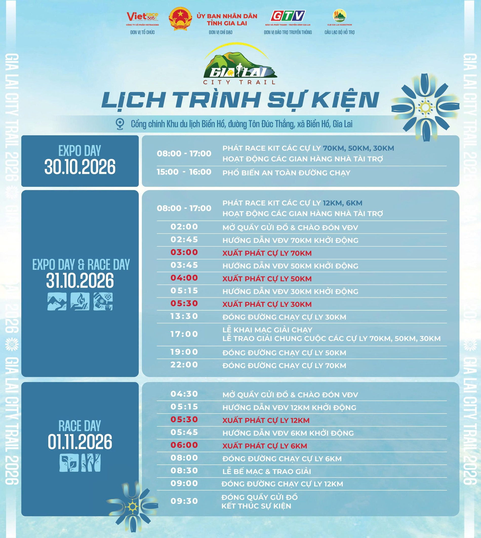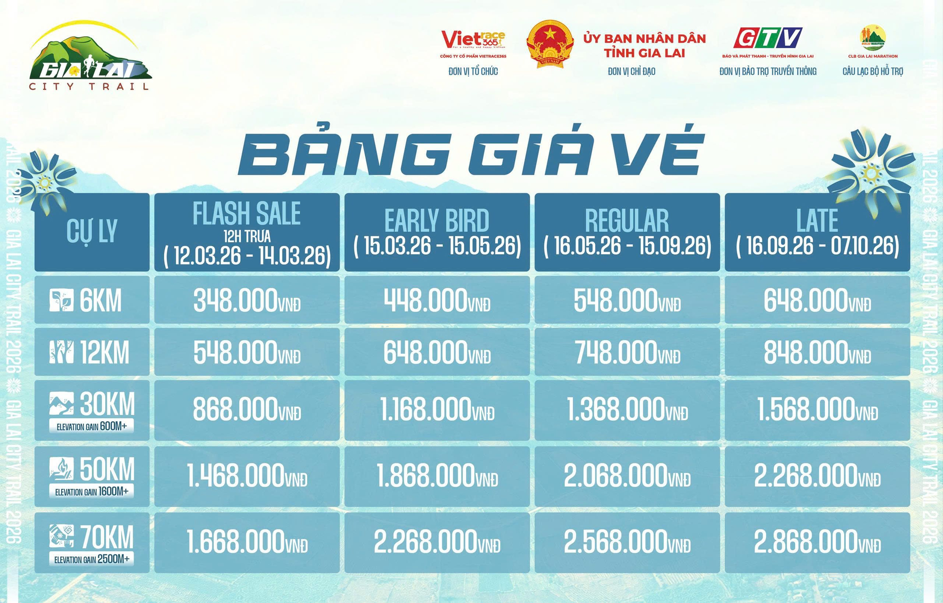 70KM | Từ 18 tuổi trở lên Bắt buộc phải đủ điều kiện đã hoàn thành một giải chạy cự ly 42km (road, city trail hoặc trail) trở lên. Có kết quả chính thức từ Ban tổ chức, trong thời gian không quá 24 tháng tính đến thời điểm ngày chạy. | 19 tiếng |